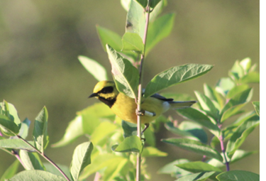 As you drive this relatively straight section of Rollo Road, stop frequently for at least five minutes at a time to listen for winged-warblers along the east side of the road. At 4.0 miles, you will pass a farm on the right. Here, the winged-warbler habitat bordering the tree line to the east moves farther away from the road. However, at 4.05 miles, the road widens on the uphill just past the farm, allowing for a good pulloff to enjoy a view to the east over the farm. If the farm is not busy, this is a good place to scan the skies and fields for raptors, swallows, and grassland birds. Beyond the farm and around a bend to the left, another patch of winged-warbler habitat comes into view on the right side of the road. With the morning sun at your back on the last 1.5 miles of Rollo Road, lighting is ideal for photographing winged-warblers and other creatures near the road. Several stops are recommended between odometer readings 4.2–4.9, with another stop at 5.0 miles, where Rollo Road crosses a stream.