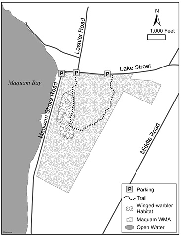 To access the WMA from the parking spot or boat launch, head south past the gate and down the slightly overgrown trail. Long pants and insect repellent are strongly recommended when exploring this ungroomed trail because biting insects can be expected. About 0.2 mile from the gate, the trail passes through several re-foresting clearings, each of which possesses suitable habitat for winged-warblers: herbaceous groundcover, scrub/shrub bushes, and adjacent deciduous forest. Winged-warblers establish territories along this 0.5-mile section of trail, which eventually turns west and north back toward VT-36. This eastern half of the trail can be wet in the spring and is difficult to follow in some sections due to the amount of overgrowth. No clearings or patches of early-successional forest are present to support winged-warblers on this eastern half of the WMA, but other warblers, flycatchers, thrushes, tanagers, woodcocks, and grouse are plentiful. While just 30–40 minutes are recommended for finding winged-warblers at Maquam WMA, a full 1.5–2.5 hours allows for birding the entire trail loop and boat launch.