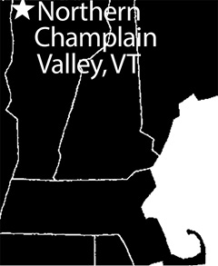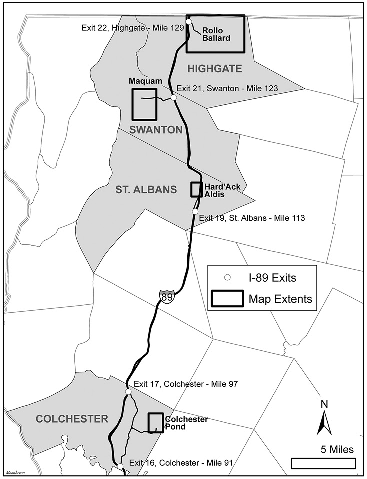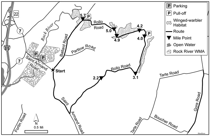 Directions: From Interstate 89, take Exit 22, the last exit on I-89 before Canada. Make a right at the end of the exit ramp onto VT–7 South, and follow this for 0.7 mile before turning left onto St. Armand Road. Pass the Rock River Wildlife Management Area and associated marsh, and continue for 0.7 mile until you reach Ballard Road on your left. This intersection (44.993983, -73.066170) marks the start of the driving loop.