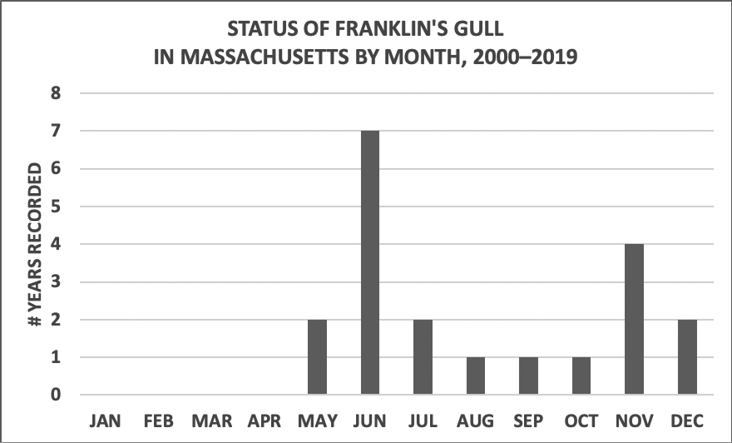 Figure. 1 June is the best month to see Franklin's Gull in Massachusetts. The chart shows the number of years in which Franklin's Gull has been recorded in Massachusetts for the period 2000–2019. Data from eBird.org