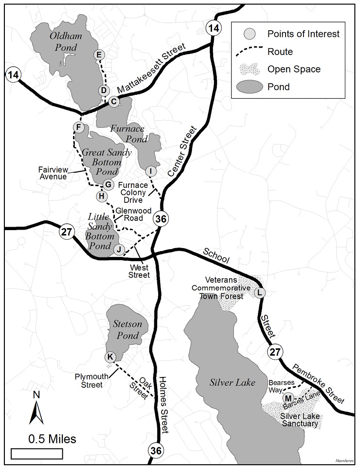 Return to West Street and take a right. At the end of the road, take a left onto School Street (Route 27 East). Take a right at the first traffic light onto Center Street (Route 36 South). In 1.5 miles, take a sharp right onto Oak Street, which becomes Plymouth Street in 0.5 mile; continue straight. Shortly, you will come to a parking lot for Stetson Pond Beach (K) on your right.