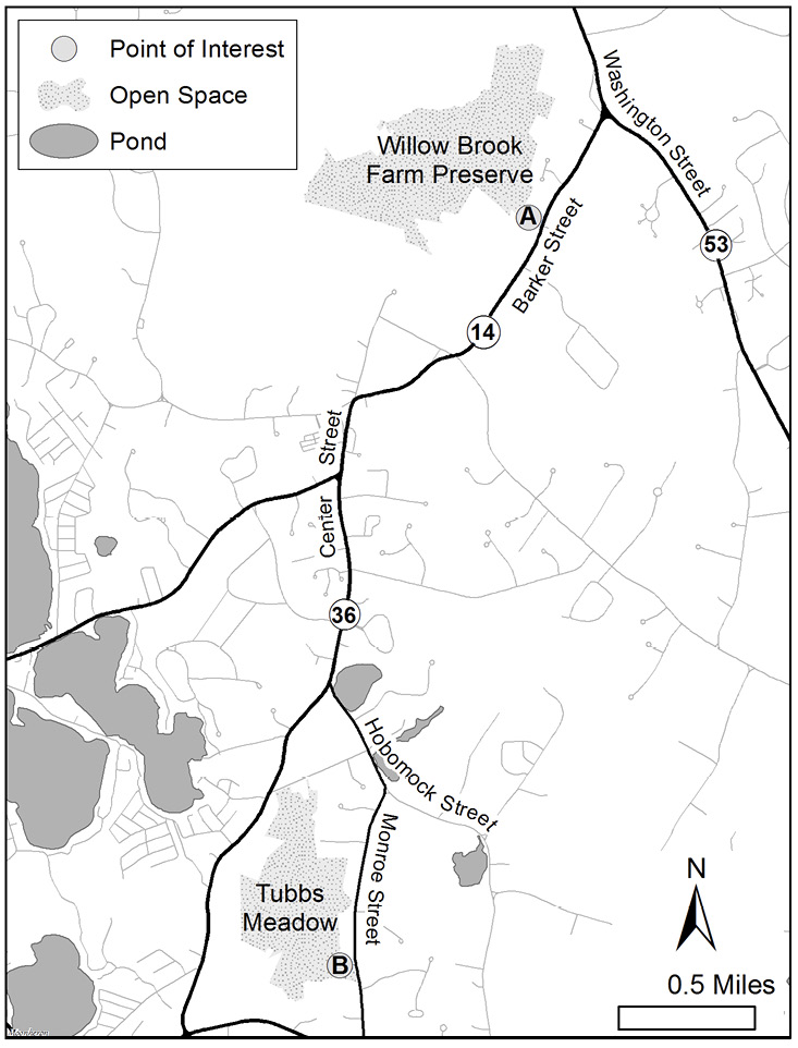 The main entrance to Tubbs Meadow (B) is about 3.0 miles from Willow Brook Farm. When you leave Willow Brook Farm, turn right onto Barker Street, which shortly becomes Center Street. In the center of Pembroke, continue straight at the traffic light to stay on Center Street. After 0.8 mile, turn left onto Hobomock Street. In 0.4 mile, turn right onto Monroe Street. In another 0.7 mile, the large gravel parking lot for Tubbs Meadow will be on your right. Trail maps are available at <http://southshoretrails.com/tubbsmeadow/> and <https://www.pembroke-ma.gov/sites/g/files/vyhlif3666/f/uploads/map_of_trails_in_tubbs_meadow.pdf>.