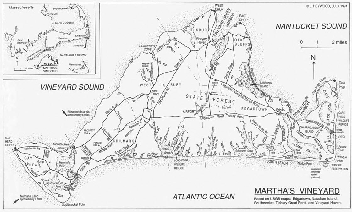 Bird Observer readers will recognize the exquisite and detailed maps prepared by Janet for Where to Go Birding articles from 1991 to 2006 (see Figure 1. Map of Martha’s Vineyard). She also prepared maps for Birding Cape Cod, published by the Massachusetts Audubon Society and Cape Cod Bird Club (1990), and A Birder’s Guide to Eastern Massachusetts, published by the American Birding Association (1994).