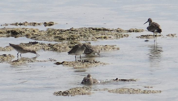 On April 18 at 5:03 pm, four Whimbrels flew in and alighted in the shallow water near two Willets. The Willets walked off but one stopped about 10 feet from the Whimbrels. At 5:30 pm, one of the Whimbrels began to bathe. The other Whimbrels preened. The nearby Willet began to bath at 5:37 pm, apparently stimulated by the nearby Whimbrels bathing or preening.