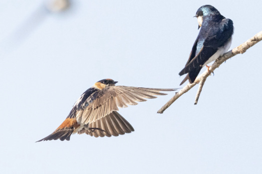 Cave Swallow has a track record of late fall vagrancy to Massachusetts, but that pattern involves birds from the western population P. f. pallida. The state’s earliest record was established in 2021 at Cherry Hill Reservoir, Newbury. The two populations are field identifiable and the Newbury bird proved to be from the Caribbean population by virtue of its much darker chestnut rump, prominent streaking on the flanks, and infusion of chestnut into the buffy throat and buffy collar, all seen well in this photo from 4/24/2021. Photo by Sam Zhang.