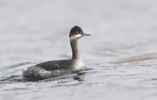 Eared Grebes, like this one on Jamaica Pond, Boston, 12/24/2020, are often first misidentified as Horned Grebes. Focus on the extensively dark face, the head shape with a peak towards the center of the head rather than the rear of the head, and especially bill color and shape. Horned has a pale tip to the bill and lacks the upward bevel at the tip of the mandible (i.e., lower mandible) that gives the bill of Eared an upturned appearance. Photograph by Ryan Schain.