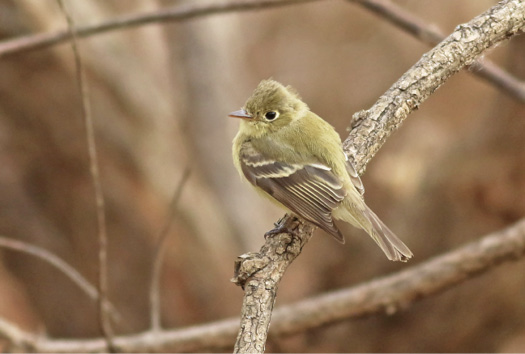 The state’s second Pacific-slope Flycatcher appeared at Fresh Pond, Cambridge, where it was photographed 11/25/2020. While recordings of the call notes (or genetics) are critical to eliminate Cordilleran Flycatcher, it is also important to eliminate Yellow-bellied Flycatcher. Notice the teardrop-shaped eye ring, brownish cast to the wings, more peaked appearance to the head, buffy versus clear yellow tinge to the wing bars in fall, and the fairly narrow extent of the dark gap below the second wing bar (more extensive in Yellow-bellied); the latter is a new field mark published in 2014 that is proving quite helpful. Photo by Jeremiah Trimble.
