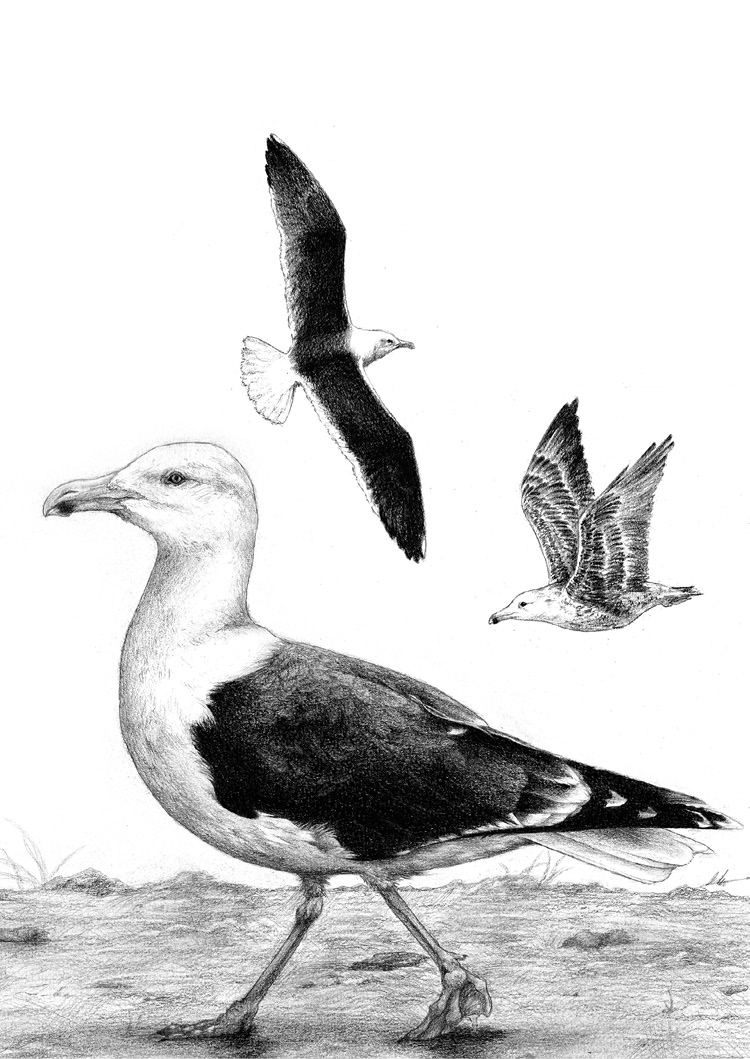 The Great Black-backed Gull (Larus marinus) is the world’s largest gull species and the most aggressive gull in North America. Adults are a striking contrast of black and white. Their heads, bodies, and tails are white, their backs are black, and their black, white-tipped wings have a ribbon of white along the trailing edge. The legs are pale pink. The heavy bill is yellow with a red spot on the lower mandible. The sexes are similar in plumage, and males are slightly larger than females. First-year birds have whitish heads, black bills, and barred or checkered backs, wings, and bodies. They have a black terminal band on the end of their white tails. Second-year birds are mottled but lighter in color. Third-year birds begin to morph into adult plumage, which is attained in the fourth year. Great Black-backed Gulls can be confused with Western Gulls, but the latter are slightly smaller, have brighter pink legs, and their ranges do not overlap. Yellow-footed and Lesser Black-backed gulls have yellow legs, and the latter are smaller overall with longer and slimmer wings. Great Black-backed Gulls are monotypic, having no subspecies. They are closely related to the Kelp Gull of the Southern Hemisphere.