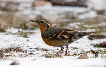 Christine Goddard of Sudbury photographed a Varied Thrush near her feeders the day before New Year’s Eve. It was the second found in New England in December. It appeared around the same time that one in Rhode Island, about 40 miles to the south, stopped showing up after a week-plus of sightings. The two were clearly different individuals—the Rhode Island bird was male and the one in Massachusetts was a female. Christine’s thrush was still visiting just before press time. Sam Zhang took the photo above.