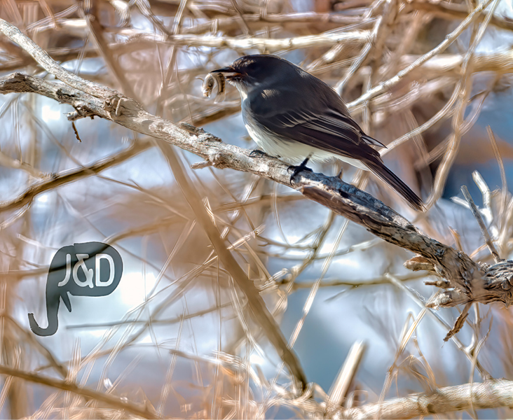 The following weekend, the temperatures soared into the 50s and the Eastern Phoebe was still present, along with numerous other species. The marsh water level had risen high enough to force me to retreat from my usual observation area. My main focus during the long winter hours I’ve spent at this location are the minks that hunt for minnows; Zylfee Brook has its share of predators. In the following weeks, the water level approached the scrub brush of the marsh. My minks were more difficult to observe as they hunted in areas deeper in the brush where the minnows got stranded in small pools. While trying to get a glimpse of the minks, I noticed the Eastern Phoebe struggling to devour something that I could not yet identify. The bird was smashing it on branches, as phoebes do with dragonflies to discard the wings, but to my knowledge there are no dragonflies in January.